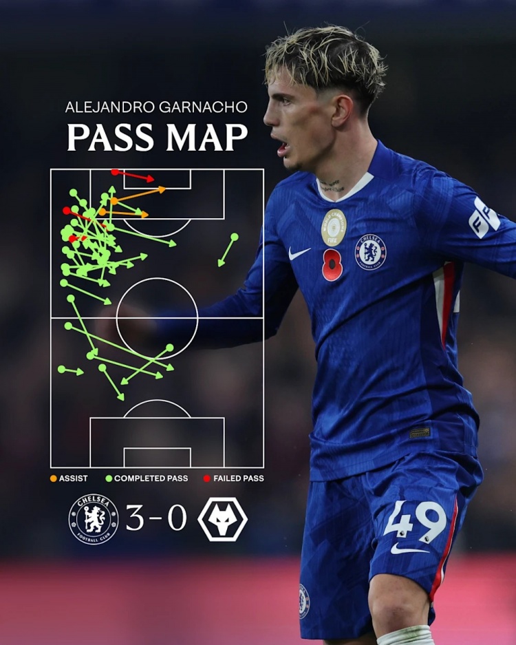 数据统计显示,这也是加纳乔生涯首次英超助攻双响。他还创造了两次绝佳机会并且在对方禁区内8次触球,防守端4次地面对抗赢下3次。他也在赛后被切尔西球迷票选为本场比赛队内最佳球员。